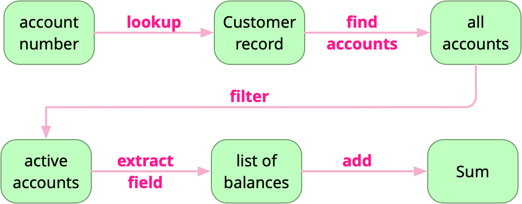 Let’s look an some typical OO code. Given an account number, it finds the correctonding customer, and from there finds the active accounts, and sums their balances.